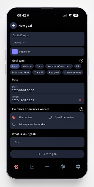 3. Choose a title, description, and color for your goal. In our example below, I’ve chosen the goal to do 1.000 reps in any variation of squats under 2026.