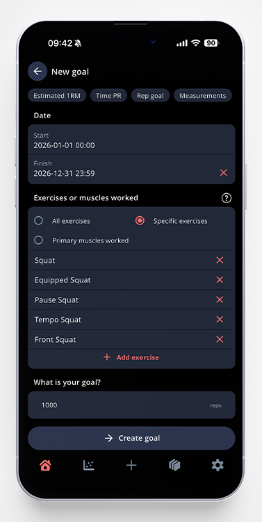 A Rep goal is the perfect choice if you want to keep track of how many reps you can do at a certain weight. This goal will show progress every time you manage to do another rep at 60 kg. (Compared to the PR goal, which will show progress every time you manage to increase the weight at a set number of reps)