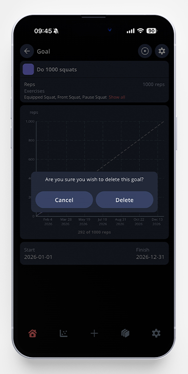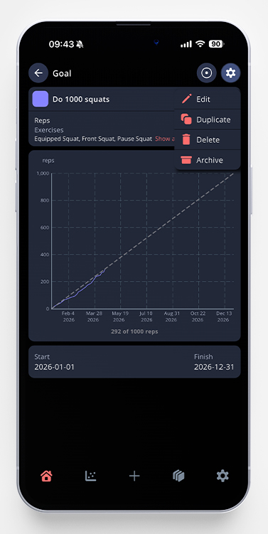 In one of my examples above, I made a goal for my squat variations. But what if I realise that I missed an exercise? Just go to the overview of said goal, tap the small gear icon and choose Edit. From here, you can change the name, description, dates, exercises and even the target of the goal. When you’re done, just tap Save goal at the bottom of the screen.