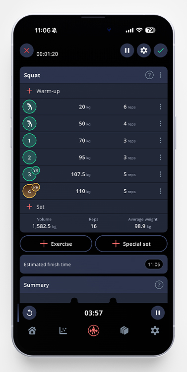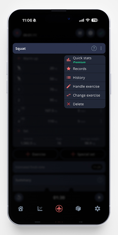 As shown above, the app notifies you that you’ve managed to hit a Yearly Record (YR!) on your third set and a Personal Best (PR!) on your fourth. These tiny marks will show up whenever you hit a new record in any exercise. If you want to take a closer look at all your personal/yearly best – just tap the three dots to the right of the exercise, and pick Records.